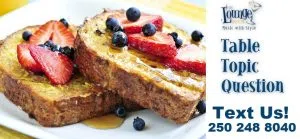 Table Topic Question It's National French Toast Day! What's your favorite topping? Answer on Facebook , or text us at 250 248 8040. You could win our ...